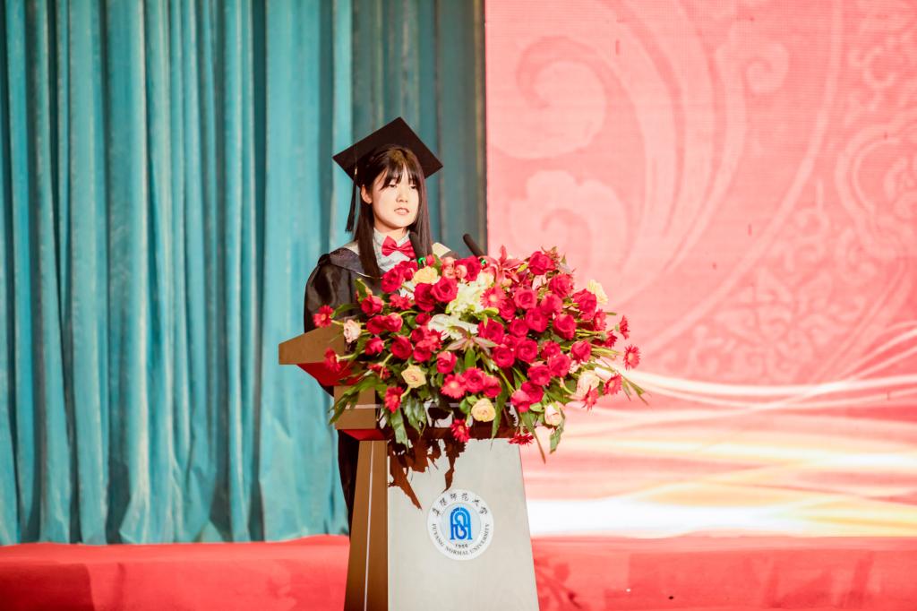 文学院教授、硕士生导师、中国古代文学博士后、《阜阳师范大学校歌》词作者、中国词学研究会理事郑虹霓老师代表全体教师上台发言。作为1995届学校本科毕业生及学校教师,她对毕业生的未来发展,提出了建议,要有梦,有志向,勇于担当;要修身,包括加强个人修养与休养生息,维护身心健康;要勤学,向书本学,向实践学;要乐群,会与不同的人打交道,好好相处,宽容友善;要关注母校的发展,用幸福与成功擦亮阜阳师范大学的校名。并祝各位毕业生前程似锦,一路顺风。