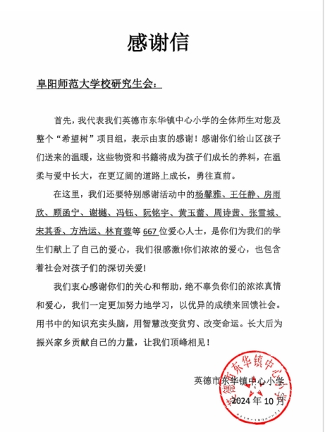 为切实贯彻习近平总书记关于青年工作的重要指示精神,引导新时代青年大学生坚定理想信念,强化社会责任与使命担当,积极为乡村振兴贡献一份力量,用实际行动参与公益事业,奉献爱心,传递正能量,10月中旬,校研究生会组织开展“伴我‘童’行,传递温暖”关爱留守儿童公益项目活动,给予留守儿童精神与心理呵护,提供书籍等物质支持,让其感受社会大家庭的温暖。近日,收到受帮扶小学寄来的感谢信和受捐证明书。